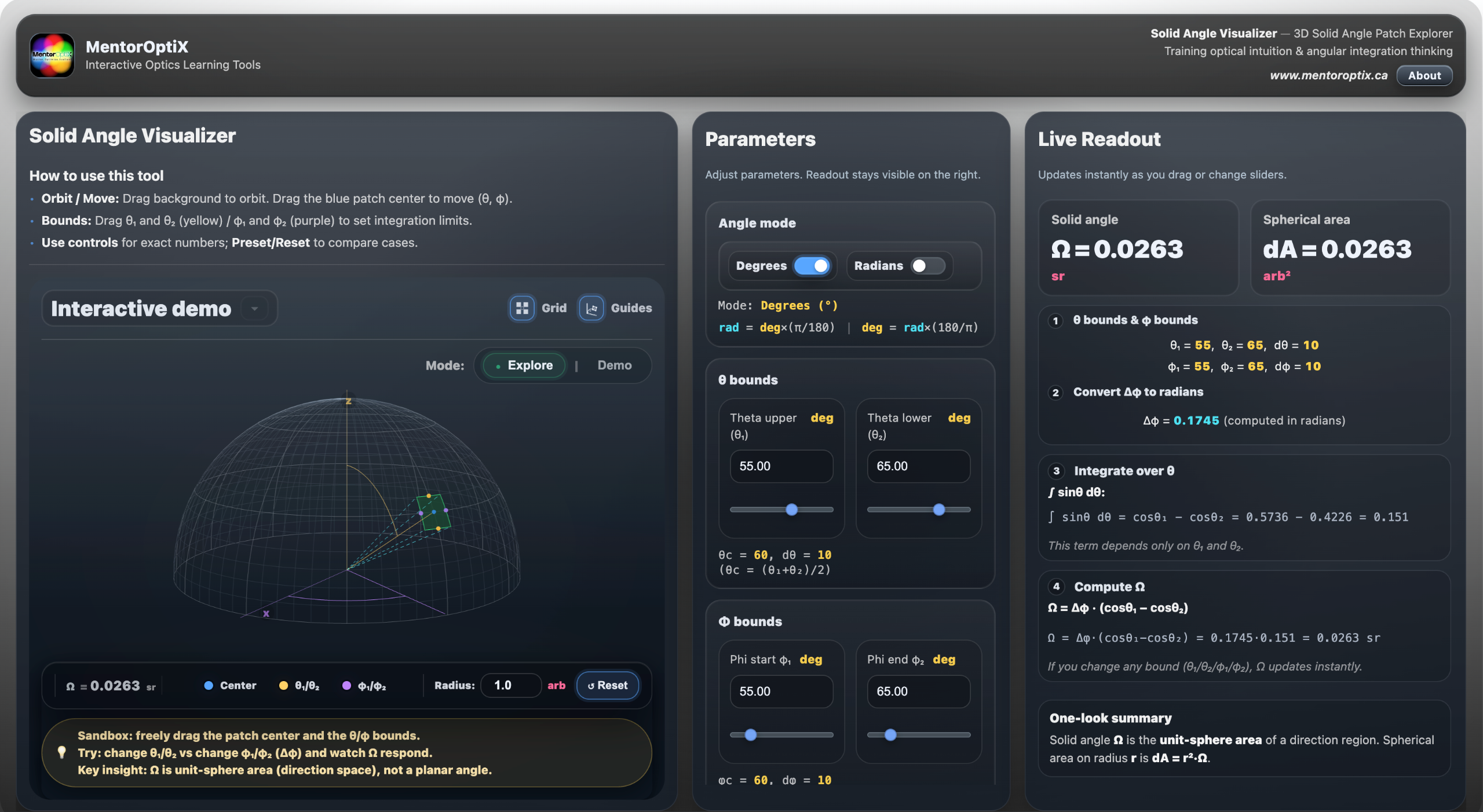Rather than treating Ω as a formula alone, it emphasizes visual reasoning—letting users manipulate angular bounds and immediately see the corresponding region on a hemisphere, along with Ω in steradians and coverage fraction.